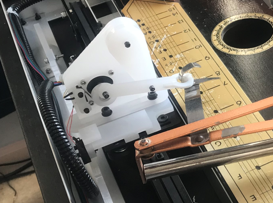 While emptying my trash a couple years back I saw a black case lying on the ground. I had to check it out, because, you know, it could have been full of money or something. Instead of cash I found an old Tremoloa instrument, which required some google searches to wrap my head around. Rising on a tide of popularity of Hawaiian music during the 1920’s, these instruments were produced in America until the 1950’s. Sad to see an antique head to the landfill, I decided to give this instrument a reason to exist in the 21st century by making it self-playing. One of my major design goals was to not modify or damage the instrument in any way.