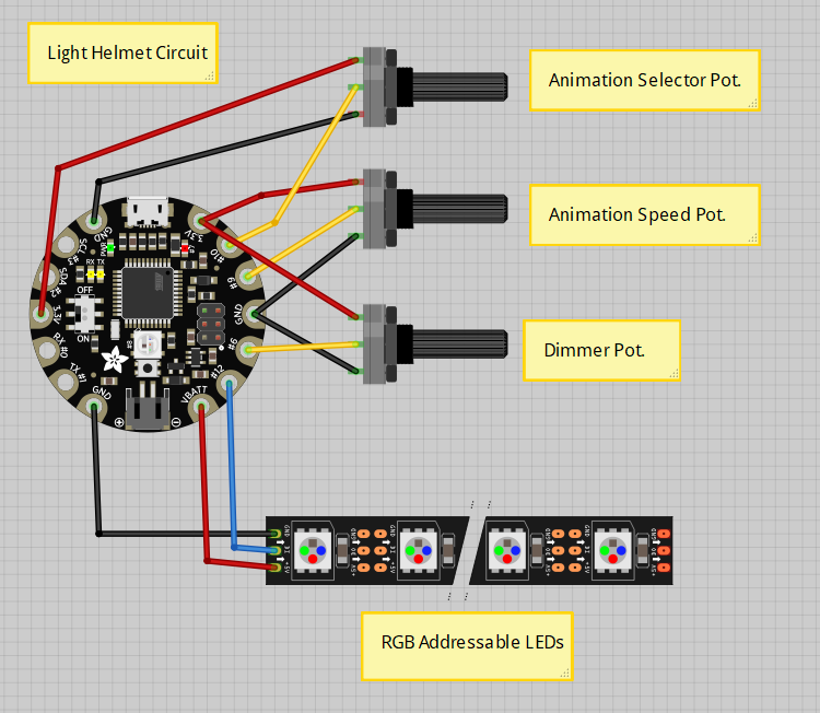 I iterated through a variety of designs over the next two months. I kept the layout of the lighting mostly the same, but explored different acrylic designs and ways to increase interactivity. My final designs include three knobs. One allows the user to change the animation of the lights, the second changes the speed of that animation, and the third adjusts the brightness. It was around this time that I decided that the best microcontroller for this job was the Adafruit Flora. It had a nice form factor for fitting into the top of the helmet and just enough analog inputs to read the three potentiometers.