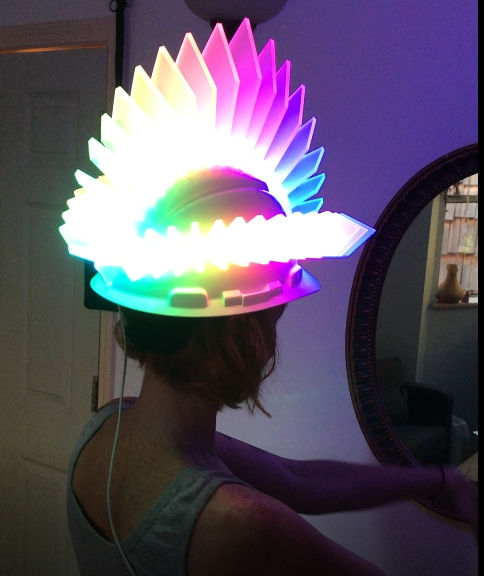 On one of my frequent inspiration trips to the local thrift stores I found an old construction helmet. I realized that the internal harness and easily adjustable headband would be perfect for keeping a heavy art project on my head while leaving some room to fit extra electronics. I purchased some strips of generic WS2812B type addressable LEDs, similar to Adafruit’s Neopixels. Using Adafruits Neopixel libraries and an Arduino Uno, I was able to get thinks blinking and create some of my own animations.